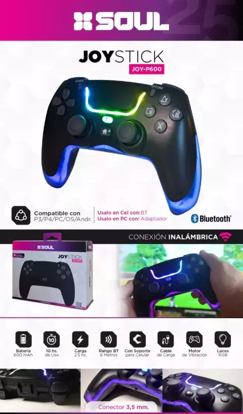 Compatible con PC/PS3PS4/Android/iOS. Conexión inalámbrica. Diseño ergonómico. Luces RGB. Motor de vibración. Cable de carga. Batería 600mAh. Tiempo de carga: 2/3hs. Distancia BT: 8mts. Autonomía: 10hs. Peso: 246gr. Color: negro.